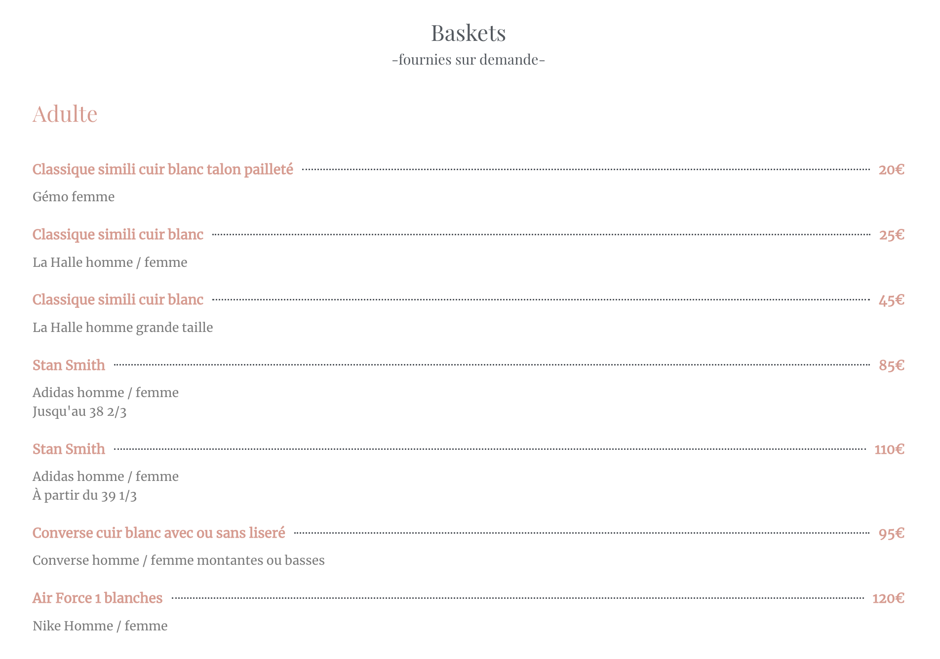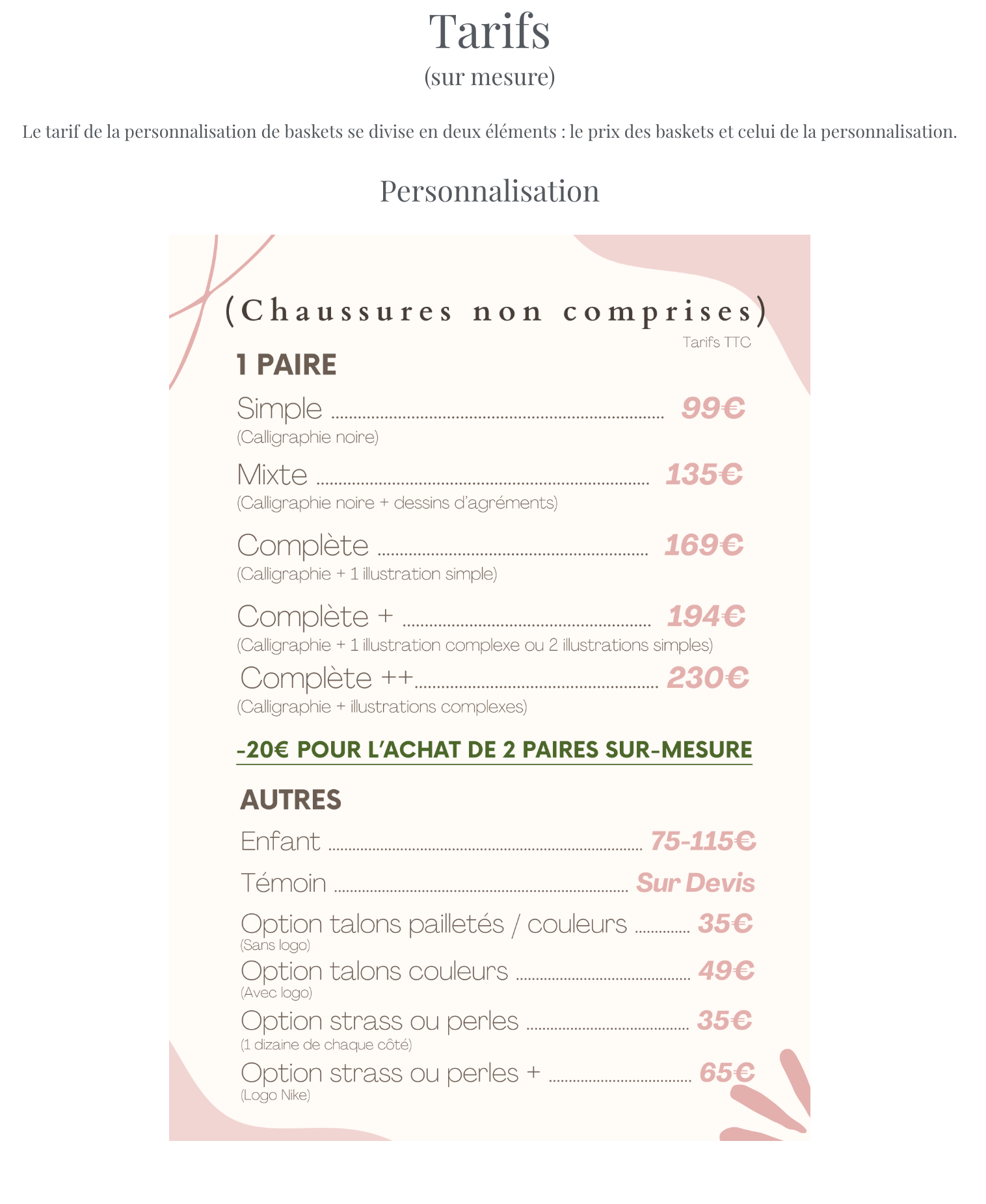 Publié sur Dorianne Gsb AlloryTrustindex vérifie que la source originale de l'avis est Google. Un immense merci à Maryse et toute son équipe pour nos baskets personnalisées ! Elles ont fait un véritable carton le jour du mariage : tout le monde les a adorées et nous n’avons eu que des compliments. Au-delà du style, ces baskets sont désormais un souvenir précieux qui restera dans le temps. Merci pour votre professionnalisme, votre créativité et votre gentillesse. Nous sommes ravis d’avoir fait appel à vous ! 💙👟✨Publié sur Clémentine ChapuisTrustindex vérifie que la source originale de l'avis est Google. Ce sont des pures merveilles, j’ai même eu une vague d’émotion en ouvrant les pochons des chaussures pour nos enfants et ma boîte à chaussures pour les miennes ! Merci infiniment pour votre travail et vos petites attentions 😊 Je recommande à 1000% si vous voulez un souvenir unique !!!Publié sur Coralie “Coco”Trustindex vérifie que la source originale de l'avis est Google. Je suis ravie de ma commande, les baskets sont très belle . Hâte de les porter …. Emballage soigné, Je recommandePublié sur Virginie DufrasneTrustindex vérifie que la source originale de l'avis est Google. Je remercie Maryse pour ces sublimes chaussures reçues dans les temps pour mon mariage ! Les couleurs sont très belles et les dessins pailletés ressortent magnifiquement bien ! Un grand merci à vous !Publié sur Isabelle N.Trustindex vérifie que la source originale de l'avis est Google. J’ai contacté Maryse, une semaine avant mon mariage et elle a su répondre à mes attentes. Je suis très satisfaitePublié sur SandrineTrustindex vérifie que la source originale de l'avis est Google. Oh Maryse !!!!!! Nos baskets commandés à l'occasion de notre mariage sont tellement canon !!!!!!!! On les a adoré, nos invités étaient bluffés et Maryse s'est montrée tellement à l'écoute pour le graphisme !!!! Une prestataire exceptionnelle, le boulot réalisé est canon !!!!!!Publié sur Nicolas GTrustindex vérifie que la source originale de l'avis est Google. Mille mercis pour avoir apporté une touche unique à mes chaussures de Mariage. Quel plaisir d'avoir pu échanger avec vous tout au long de cette création. Pour ceux qui hésitent, allez y les yeux fermés. Je vous souhaite le meilleur pour la suitePublié sur Anais GouhierTrustindex vérifie que la source originale de l'avis est Google. Personne à l’écoute et réactive, hâte d’être à mon mariage pour porter mes magnifiques baskets 👟 !! Totalement à mon image, sobre personnalisé avec une touche pailletée. Une oeuvre d’art aux pieds qui me suivra même après le mariage ?Publié sur Gaëtan FafetTrustindex vérifie que la source originale de l'avis est Google. Nous avons passé commandes ma future femme et moi pour deux paires de converses customisées pour notre Mariage, tout a été au top du début à la fin, que ce soit le passage de commande ou le suivi. Nous avons hâte de les porter, merci à toute l'équipe pour votre attention ! ☺️Publié sur ValérieTrustindex vérifie que la source originale de l'avis est Google. Commande passée pour notre mariage le 31 mai , un grand choix pour m'a personnalisation. Envoi rapide Et une très belle surprise. Un grand merci❤️❤️