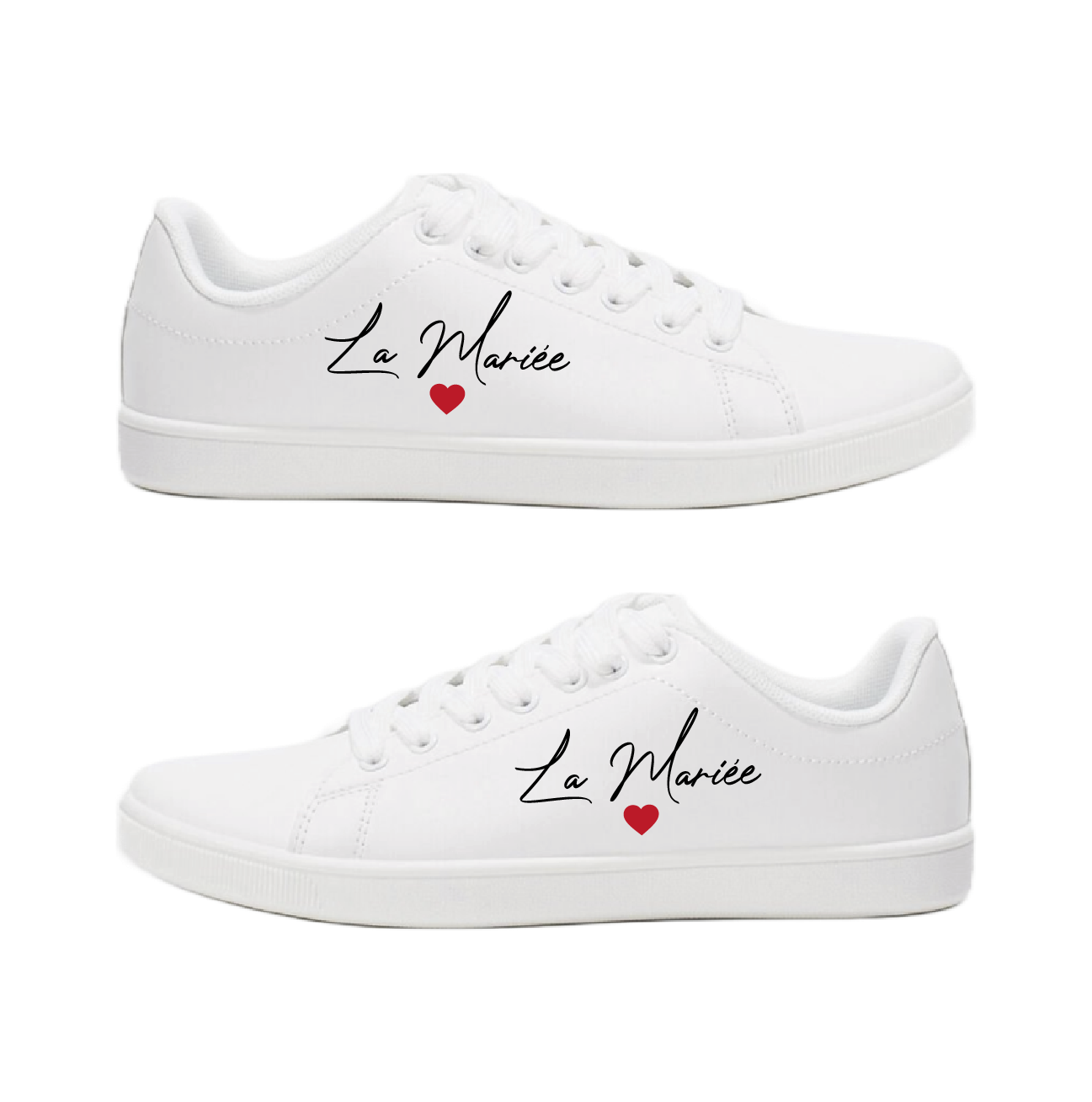 – Chaussure gauche : inscription « La Mariée » + coeur rouge ou « Le Marié » + noeud papillon noir